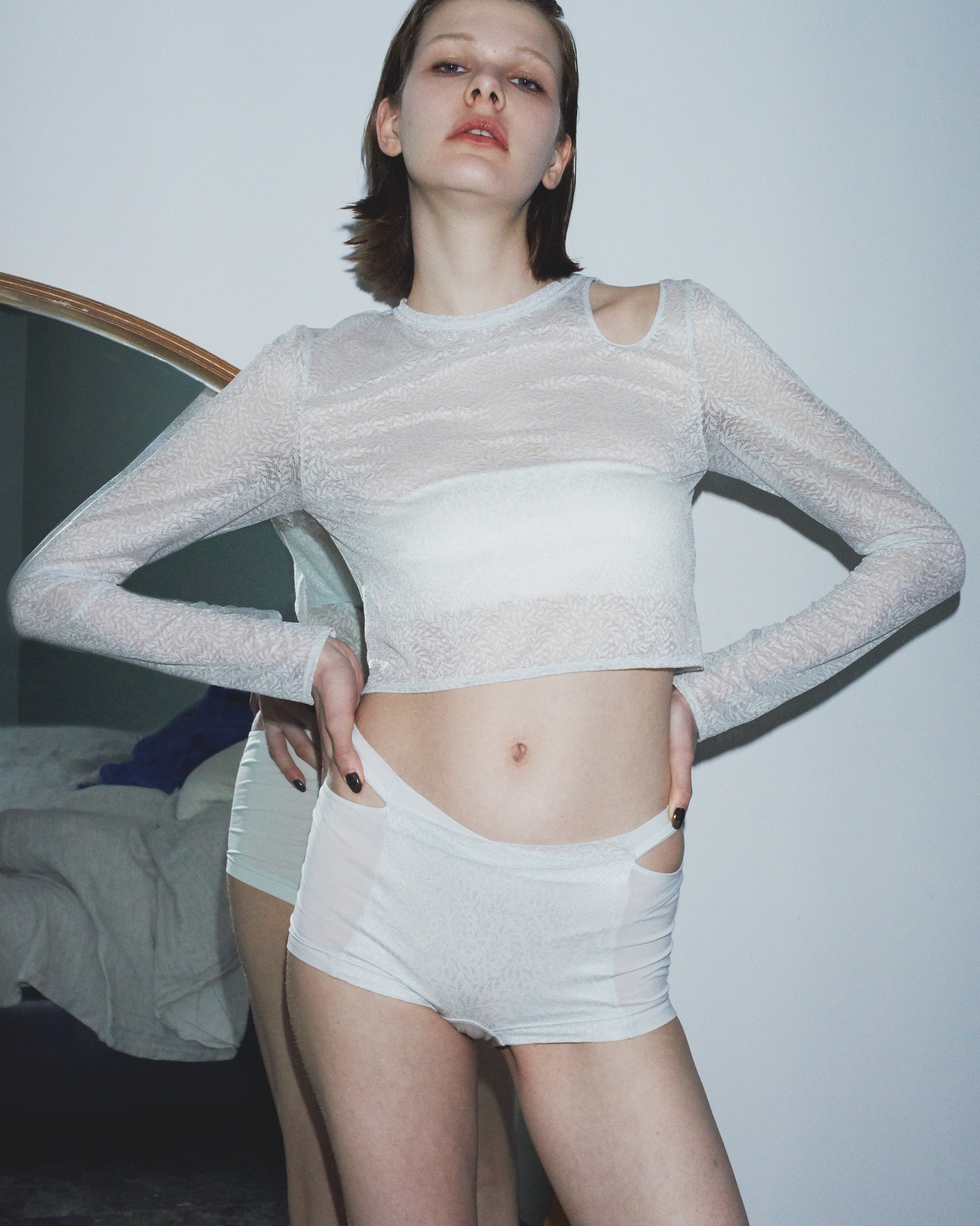 COTTON STRETCH FRONT CROSS LACE BRA ¥15,400 / COTTON STRETCH SIDE OPEN MAXI SHORTS ¥5,280