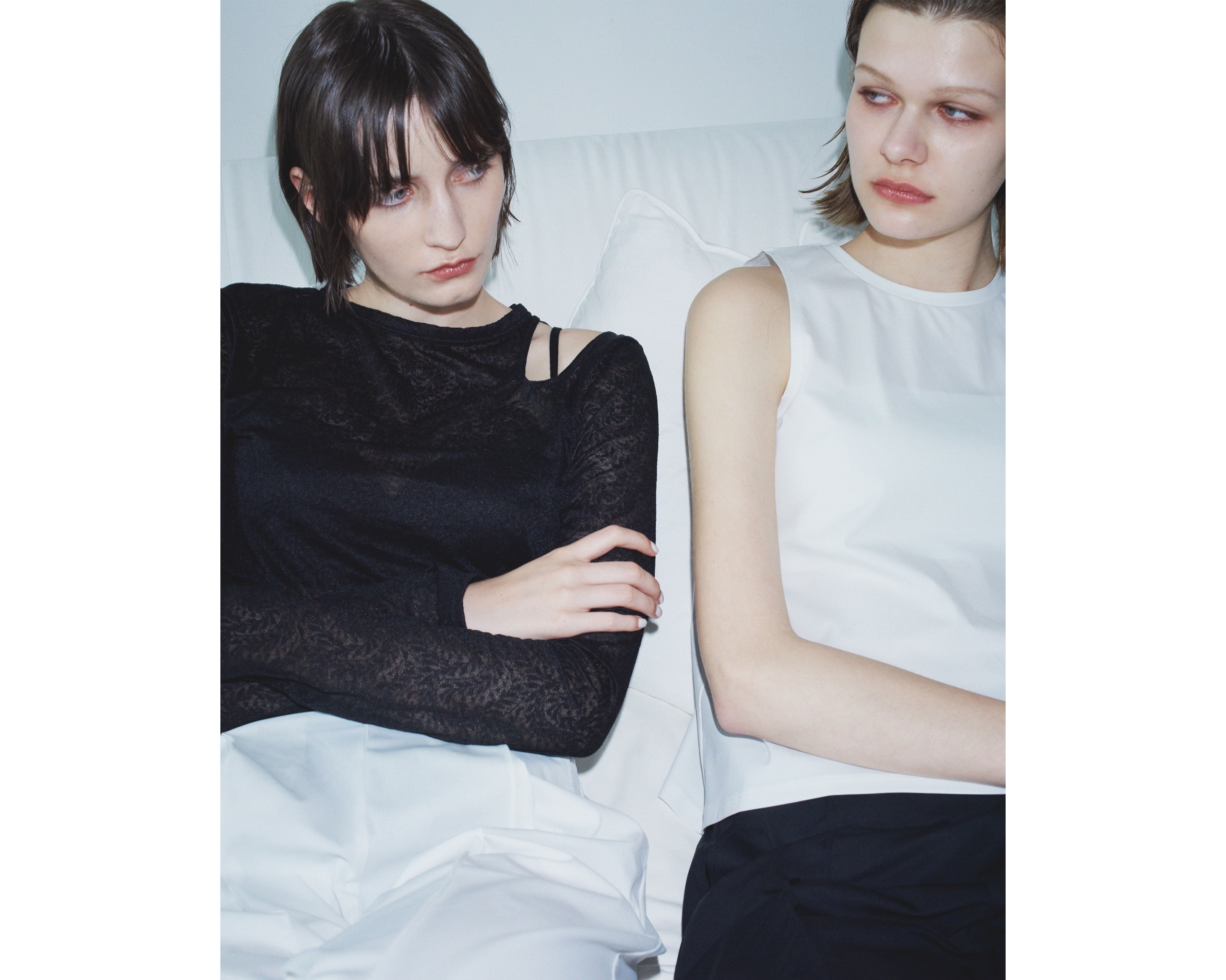 COTTON STRETCH LACE CUTOUT TOPS ¥16,500 / BACK SLIT TANK ¥12,100 / WIDE PANTS ¥22,000